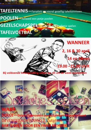 Regelmatig is het mogelijk om bij DOLCE aan het Deventerachterpad 2 in Zutphen op de dinsdagavond van 19.00-21.00 uur diverse spellen te spelen: Tafeltennis, poolen, gezelschapsspellen of tafelvoetbal, het kan allemaal.