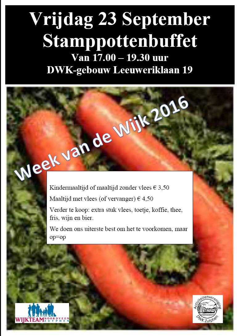 Al vanaf het eerste jaar dat de Week van de Wijk in Noordveen werd georganiseerd is het stamppottenbuffet een vast element van deze feestweek. Vijftien jaar lang werd deze gehouden in Polbeek. Dit jaar is het voor het eerst op een nieuwe locatie, namelijk in het DWK-gebouw, maar het wordt door een ervaren team verzorgd. U bent van harte welkom om een maaltijd te komen eten!