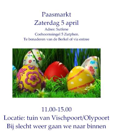 Op zaterdag 5 april 2014 organiseert Sutfene aan de Coehoornsingel 5 een Paasmarkt in de tuin van Vischpoort/Olypoort en nodigt daarvoor wijkbewoners van harte uit. Op de markt in paassfeer zal van alles te zien en te koop zijn. Van bloemstukjes en sieraden tot cupcakes en chocoladepaashazen, maar er is ook een rommelmarkttafel en een verloting met leuke prijsjes. Een bezoek van de Paashaas, speciaal voor de kinderen, maakt de Paasmarkt die van 11.00 tot 15.00 uur zal duren, compleet. De toegang tot de markt is gratis. Mocht het onverhoopt geen mooi weer zijn, dan verplaatst de markt naar binnen.