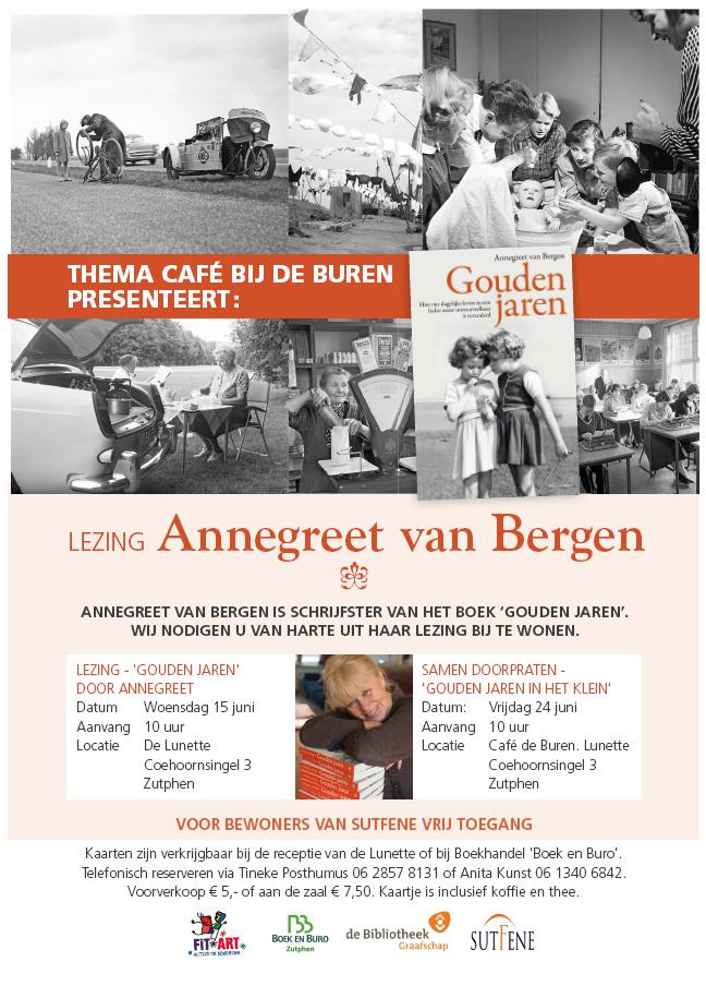 Themacafé Gouden Jaren (Annegreet van Bergen)Nieuws Annegreet van Bergen is schrijfster van het boek ‘Gouden jaren’. U wordt van harte uitgenodigd om haar lezing bij te wonen. Waar, wanneer, alsmede hoe u aan een kaartje komt, kunt u lezen in onderstaande poster.