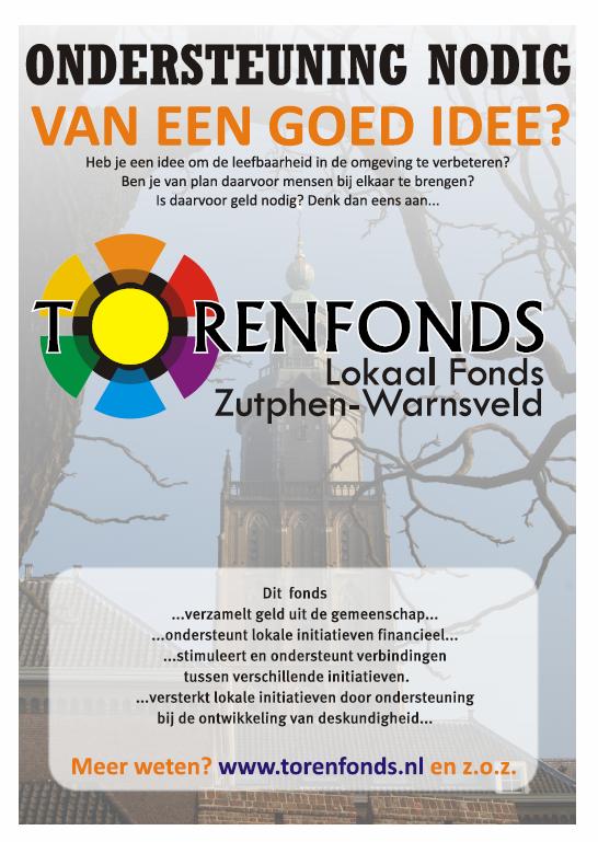 In het jaar 2016 heeft het wijkteam – evenals diverse andere wijkteams – een bijdrage vanuit wijkbudget gedaan aan het Torenfonds, als eenmalige ondersteuning voor de opstart van het initiatief met als uitgangspunt dat de investering de wijk weer ten goede komt aan de wijk. Dit omdat wijkbewoners uit dit fonds niet alleen geld kunnen krijgen, maar ook de ondersteuning bij het uitwerken van hun initiatief kunnen ontvangen, die wij als wijkteam niet (op die manier) kunnen bieden. Wij gaan ervan uit dat de geïnvesteerde bijdrage zich dus dubbel en dwars aan de wijk zal terugbetalen. De eerste verwijzing van wijkbewoners naar het Torenfonds heeft in 2016 ook al plaatsgevonden.