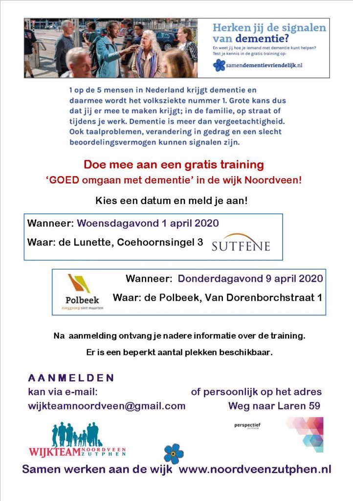Polbeek, Sensire (voorheen Sutfene), Perspectief Zutphen en Wijkteam Noordveen bieden inwoners van de wijk Noordveen een gratis training ‘GOED omgaan met dementie aan’. Zie de informatie op de flyer hieronder.