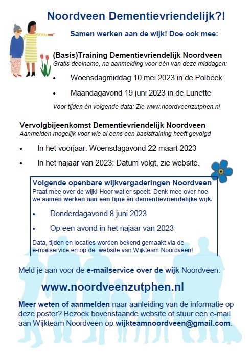 De werkgroep ‘Dementievriendelijk Noordveen’ zal de komende periode meer bijeenkomsten voor inwoners, organisaties en/of ondernemers in Noordveen gaan organiseren en eventuele andere acties ondernemen ten behoeve van een dementievriendelijke wijk.