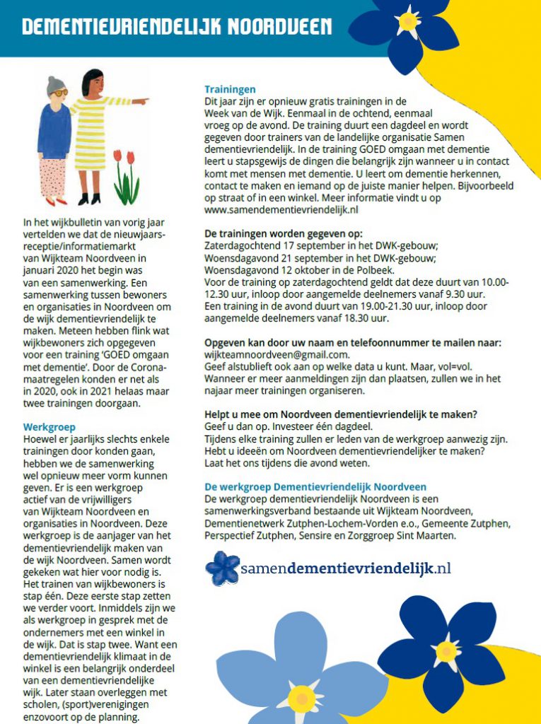 UPDATE augustus 2022: In de Week van de Wijk 2021 was het tweemaal mogelijk mee te doen aan een training GOED Omgaan met dementie. Ook na de Week van de Wijk was er nog een training op 13 oktober 2021. De daarna geplande trainingen konden vanwege het coronavirus helaas niet plaatsvinden. Maar in september en oktober 2022 vonden er weer trainingen plaats. Hierover kunt u lezen in het wijkbulletin dat begin september huis-aan-huis verspreid is in Noordveen. De betreffende pagina kunt u eveneens hieronder lezen: