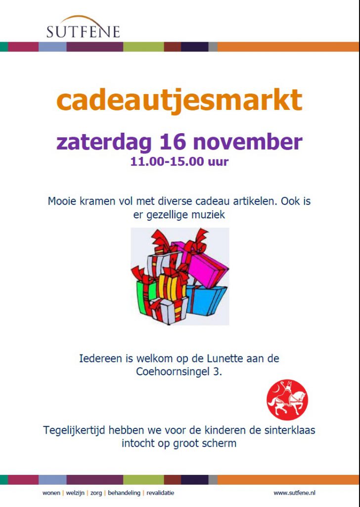 Zaterdag 16 november van 11.00 uur tm 15.00 uur is de jaarlijkse cadeautjesmarkt in de Lunette van Sutfene Coehoornsingel 3 te Zutphen.