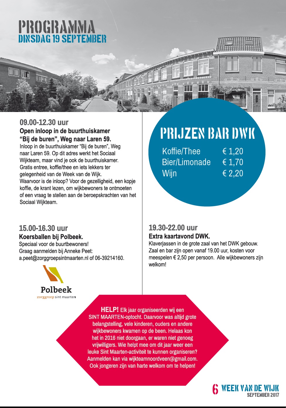 Week van de Wijk programma dinsdag 19 september / Nieuws, Projecten, Week van de wijk, Week van de wijk 2017 / Door Chantal Elskamp Hieronder kunt u lezen welke Week van de Wijk-activiteiten plaatsvinden op dinsdag 19 september 2017.