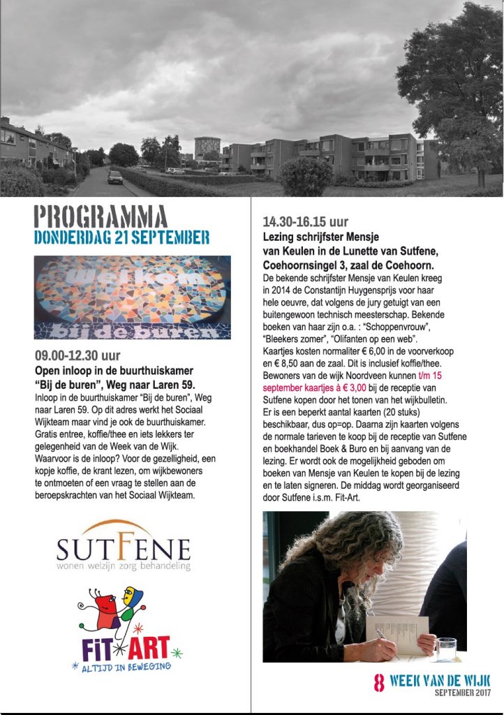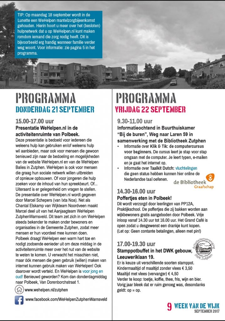 Week van de Wijk programma donderdag 21 september / Nieuws, Projecten, Week van de wijk, Week van de wijk 2017 / Door Chantal Elskamp Op donderdag 21 september vinden de volgende Week van de Wijk-activiteiten plaats (twee pagina’s info hieronder):