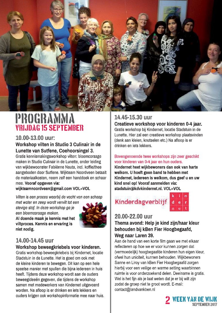 De Week van de Wijk 2017 begint op vrijdag 15 september. Die dag zijn er verschillende workshops en een informatieavond. Wanneer u hieraan wilt deelnemen, geeft u zich dan spoedig op, want vol=vol…