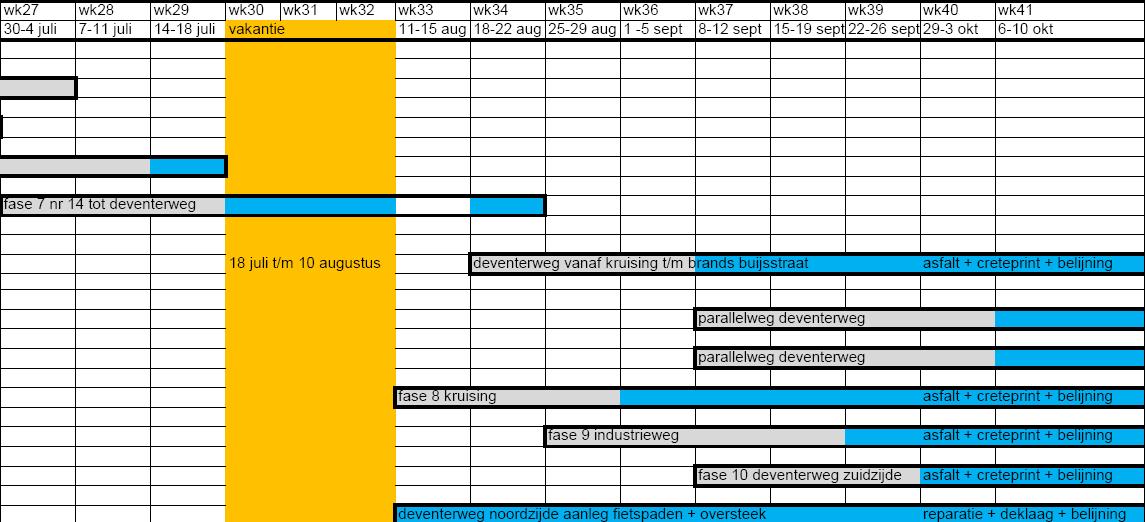 Direct na de vakantie, op maandag 11 augustus, wordt verder gewerkt volgens planning van fase 7: Opbreken, frezen rijbaan Deventerweg en aanbrengen straatwerk in fase 6 (Van der Capellenlaan).