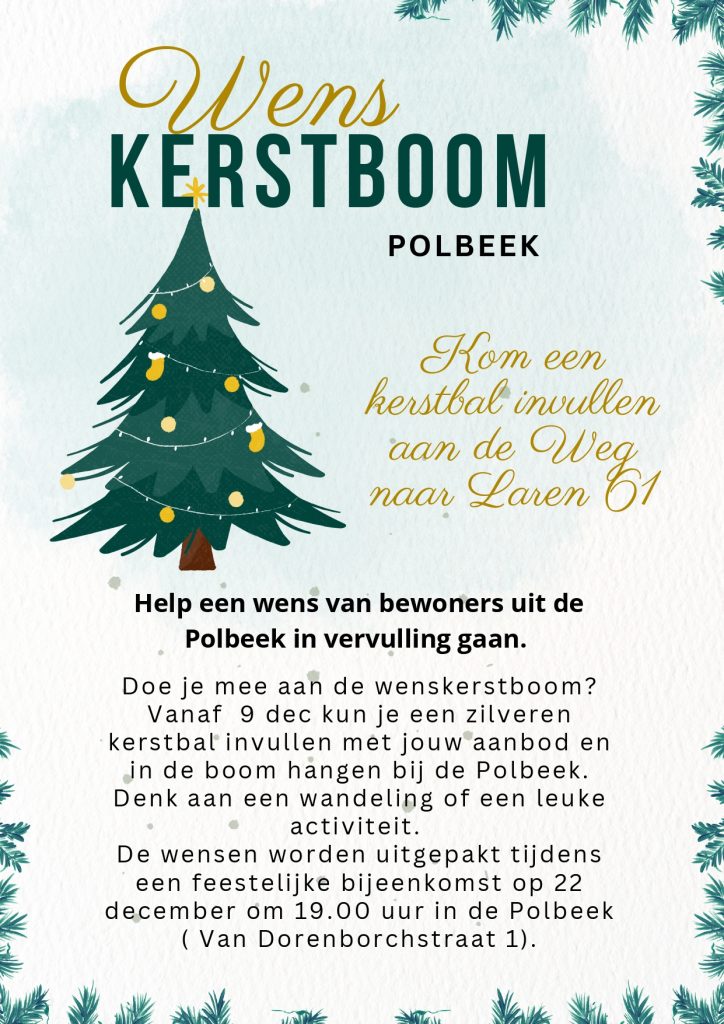 Bewoners van de Polbeek kunnen een wens opschrijven op een speciale kerstbal. Deze kerstballen zijn vanaf 9 december af te halen bij de medewerkers van het restaurant. Bewoners uit Noordveen worden eveneens van harte uitgenodigd om een kerstbal in de boom te hangen — niet met een wens voor zichzelf, maar met wat zij zouden willen betekenen voor de bewoners van de Polbeek. Denk aan een wandeling maken, een bakactiviteit organiseren of een andere vorm van ontmoeting en verbinding.