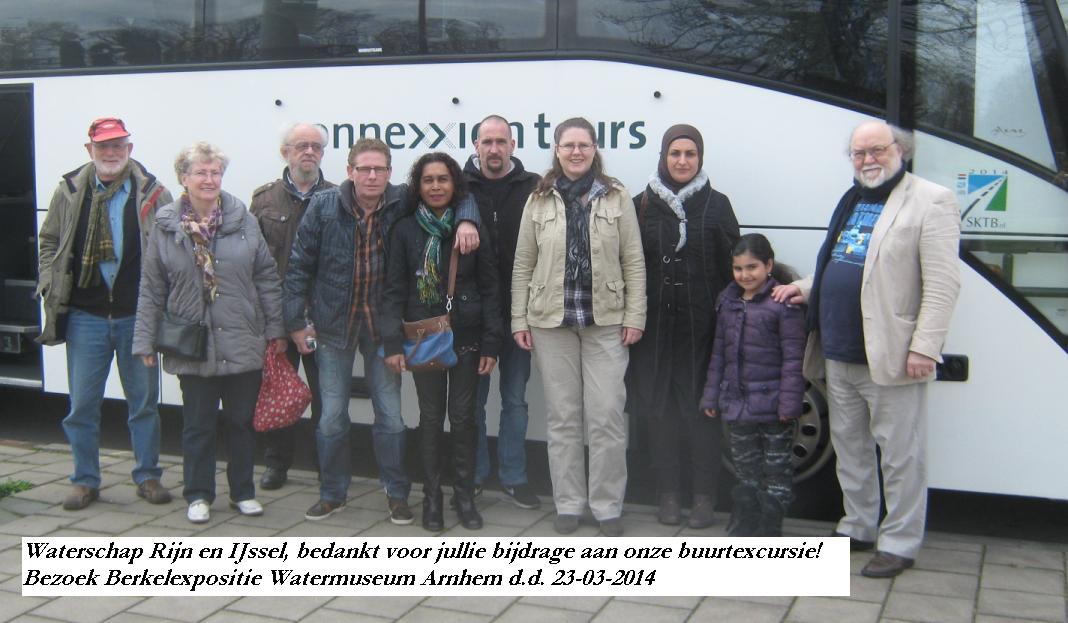 Wijkbewoners bezochten op Wereld Waterdag, afgelopen zaterdag 23 maart, de Berkelexpositie in het Watermuseum te Arnhem. Het initiatief tot het organiseren van deze ‘buurtexcursie’ werd genomen door Bewonerscommissie Berkelpark naar aanleiding van de betrokkenheid van bewoners bij het project ‘Verlegging Berkel’ in het Wijnhofpark in de buurt Berkelpark. Waterschap Rijn en IJssel sponsorde om dezelfde reden de bustocht vanuit de Van Drinenstraat in Zutphen naar het Watermuseum in Arnhem en vice versa. Bezoekers ontvingen zaterdag van het Watermuseum 50% korting op de entreeprijs omdat het Wereld Waterdag was. Met interesse werd de Berkelexpositie door de excursiedeelnemers bewonderd. Diverse geëxposeerde foto’s en plattegronden waren herkenbaar vanuit de eigen woon/leefomgeving, er was echter ook veel informatie over de geschiedenis van de Berkel vanaf ongeveer 1643 tot heden. De expositie op de bovenverdieping van het museum is nog tot 27 maart 2014 te bekijken, daarna zal een andere expositie worden ingericht. De vaste onderdelen van het Watermuseum, dat een echt doe-museum is, zijn door de deelnemers eveneens met interesse bekeken en uitgeprobeerd. De middag was snel voorbij en voor het eveneens geplande bezoek aan Park Sonsbeek is besloten dit later in het jaar gezamenlijk te bezoeken wegens tijdgebrek. Kortom, buurtbewoners hadden een geslaagde en leerzame middag die voor herhaling vatbaar is.