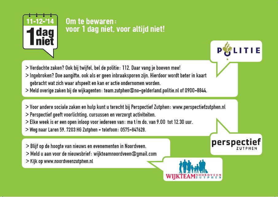 Voorafgaand aan de actiedag 1-dag-niet Noordveen op 11-12-14 gingen een kleine twintig wijkbewoners ‘langs de deur’ in de wijk om medewijkbewoners persoonlijk te vragen mee te doen aan de actie en hen informatie te geven.