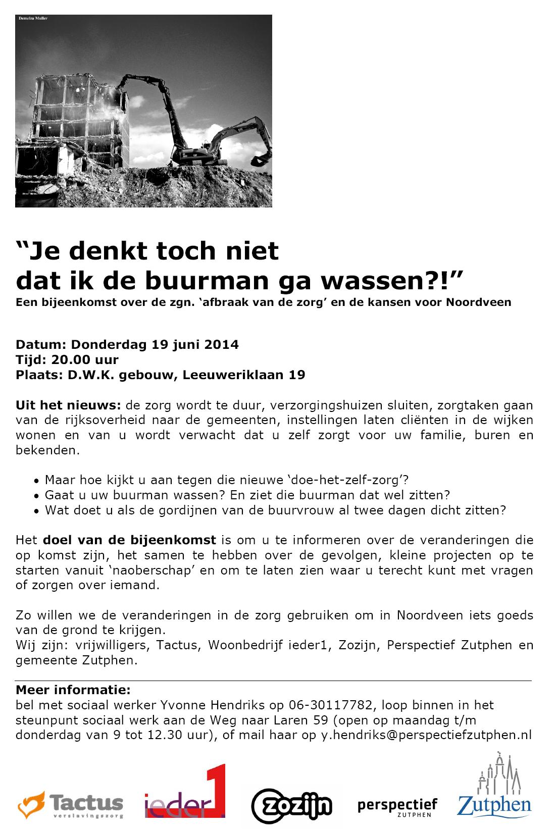 Op donderdagavond 19 juni 2014 organiseren diverse beroepskrachten die werkzaam zijn in de wijk Noordveen, een bijeenkomst voor wijkbewoners. Deze vindt plaats in het DWK gebouw en begint om 20.00 uur.
