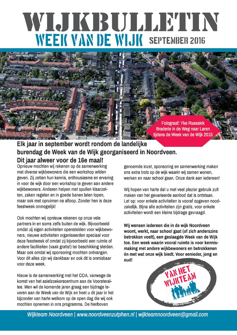 Op donderdag 1 september 2016 is-ie in Noordveen huis-aan-huis verspreid: Het Wijkbulletin met daarin o.a. het programma van de Week van de Wijk 2016!