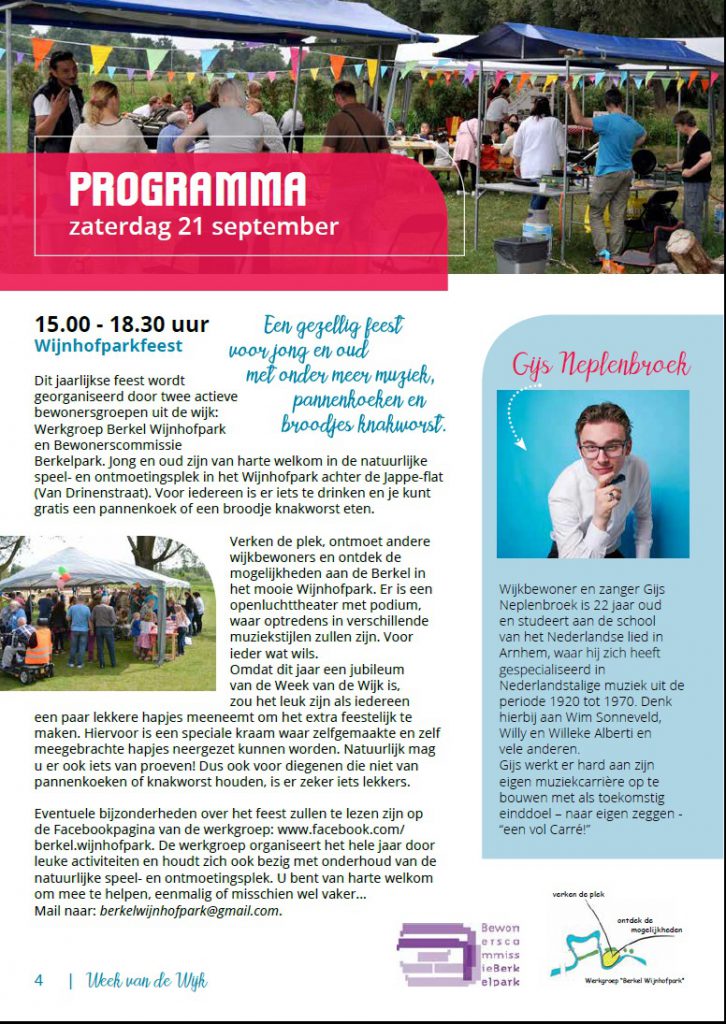 Wijnhofparkfeest tijdens Week van de Wijk / Nieuws, Projecten, Week van de wijk, Week van de Wijk 2019 / Door Chantal Elskamp Op zaterdag 21 september is er van 15.00 – 18.30 uur het Wijnhofparkfeest, een gezellig feest voor jong en oud met onder meer muziek, pannenkoeken en broodjes knakworst.