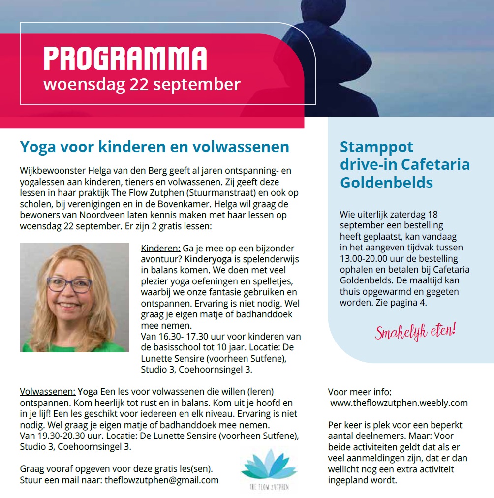 Op woensdag tijdens de Week van de Wijk 2021 is er yoga voor kinderen in de middag en voor volwassenen in de avond. Geef je snel op voor een gratis les door te mailen naar theflowzutphen@gmail.com.